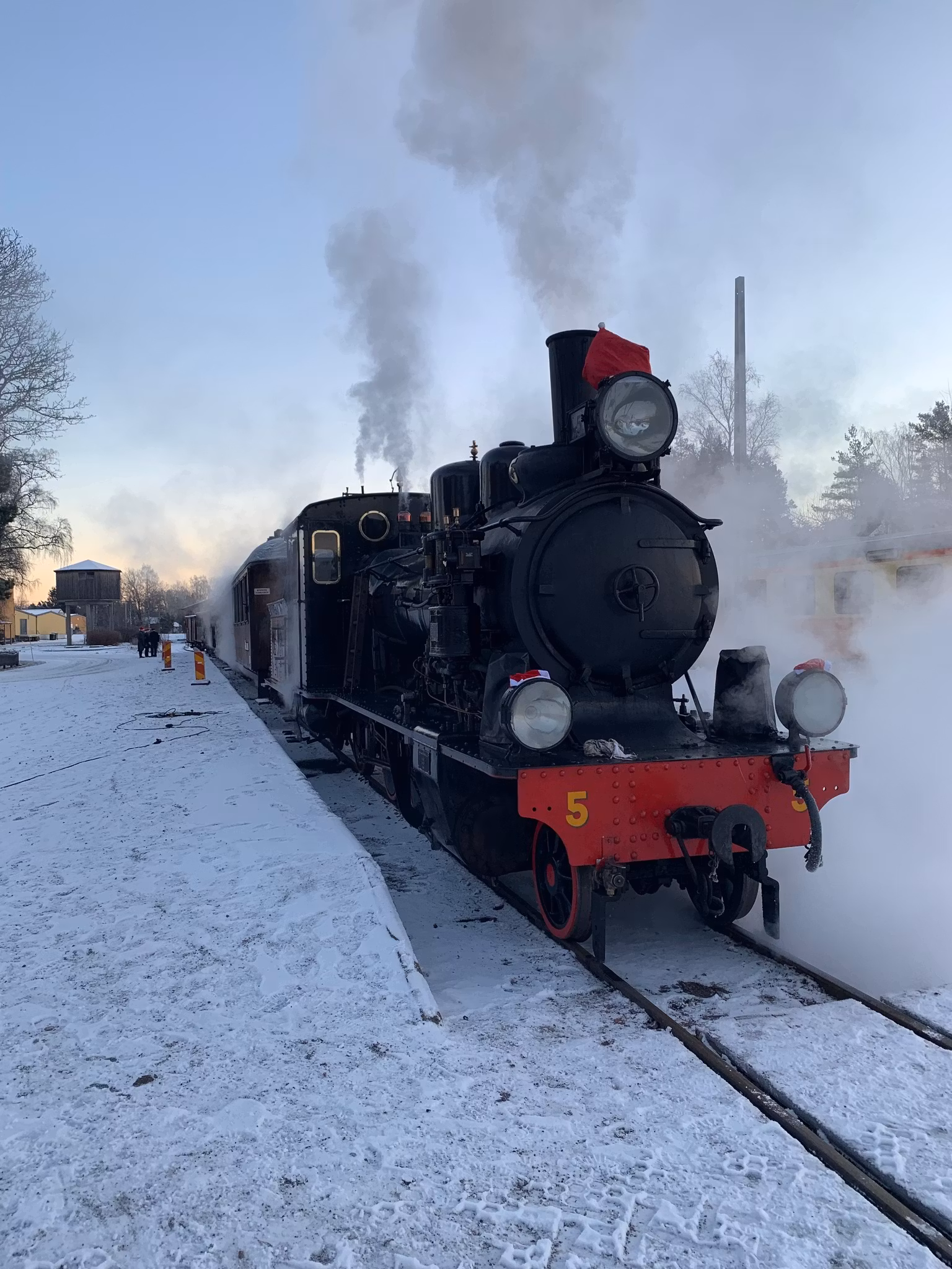 - En tur- och returresa mellan Faringe och Almunge med det mysigt julpyntade tomtetåget som dras av ånglok